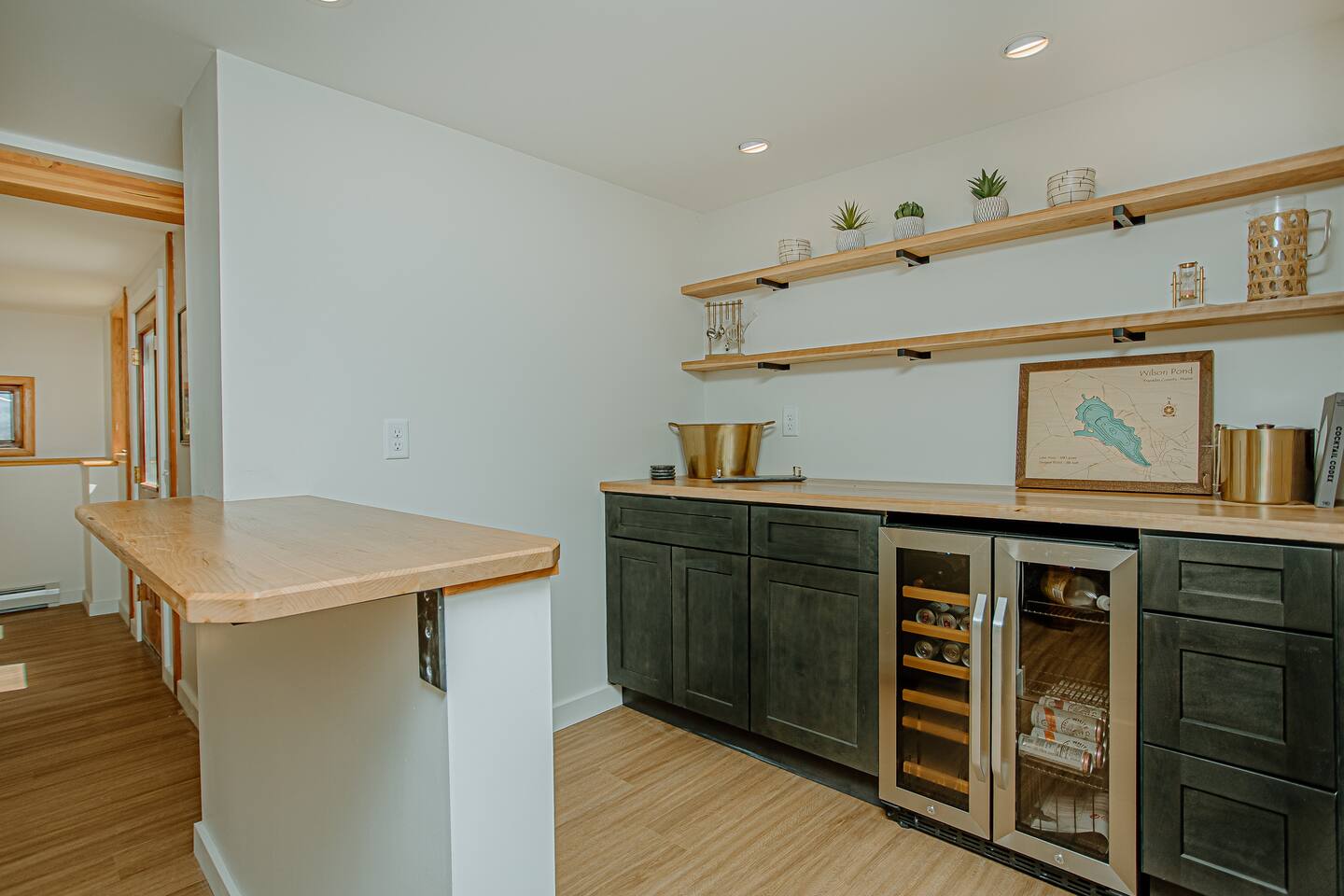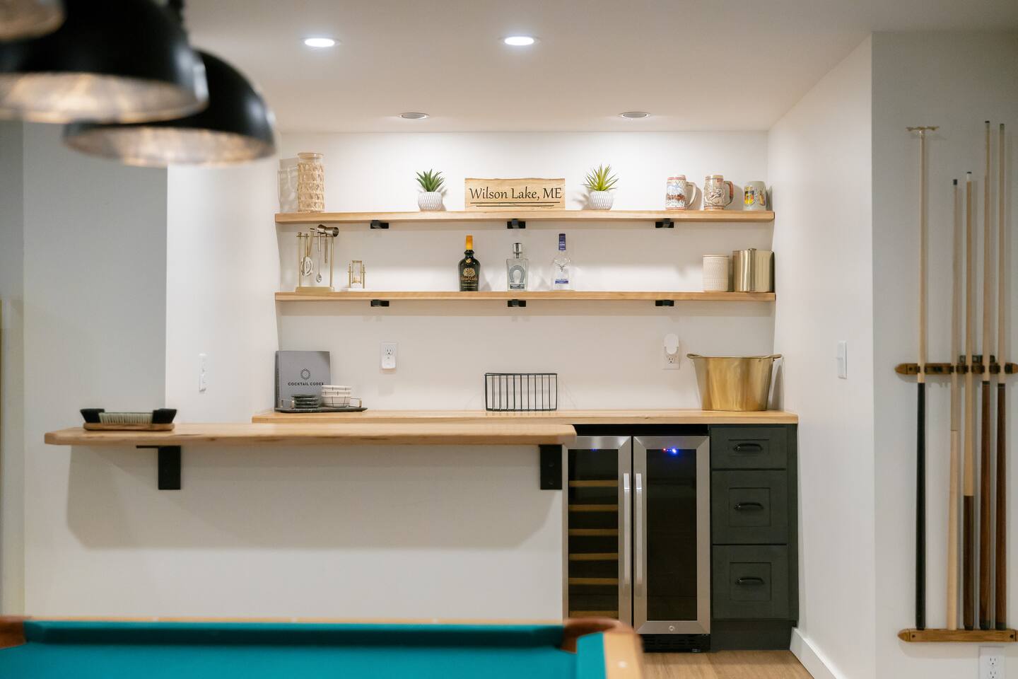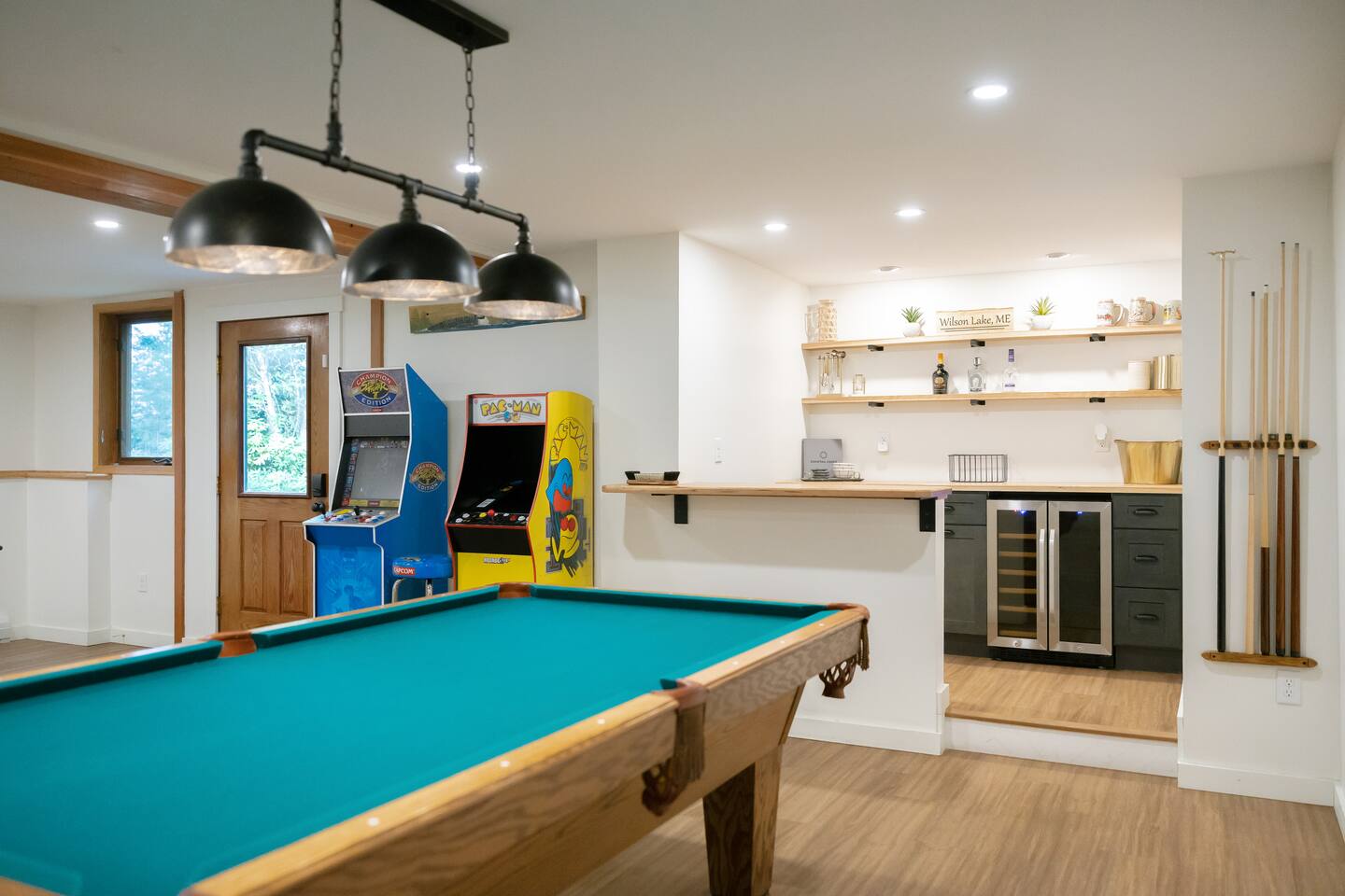 Blueberry Point – A Four-Season Lakeside Retreat in Central Maine Nestled on one private acre with year-round access via a wooded road, Blueberry Point offers panoramic lake views, modern comforts, and a peaceful connection with nature. The home features a spacious deck, a cozy sunroom, and a living room with glass doors that frame stunning views of Wilson Lake. A large great room with a wood-burning stove creates a warm, welcoming space for gatherings. All areas have been recently remodeled and thoughtfully furnished for a comfortable stay. Inside the Home The house comfortably sleeps up to 12 guests with four bedrooms and additional sleeping arrangements: Primary Bedroom: King bed with en suite bathroom Bedroom 2: Twin XL over Queen bunk with Twin XL trundle Bedroom 3: Twin XL over Queen bunk with Twin XL trundle Bedroom 4: Twin bunk beds, crib, and built-in desk — ideal for little ones and remote work Additional: Pack 'n Play available The fully equipped kitchen includes cooking essentials, spices, flatware, dishware, knife set, toaster oven, and Keurig coffee makers. Enjoy meals at the oversized dining table while soaking in lake views. Smart TVs, board games, puzzles, ceiling fans, children’s toys, and books are provided for indoor comfort and family fun. Outdoor Amenities & Recreation Private dock (seasonal)* with Adirondack chairs Fire pit with ample seating overlooking the lake Chiminea with additional seating for cozy evenings Use of lake equipment including canoe, kayak, two SUP boards, tubes, and assorted life vests Spacious front porch & outdoor picnic area Backyard games and open space for relaxing Rec Room Highlights Pool table, foosball, ping pong Classic arcade games including Pac-Man and Street Fighter Board games and cozy hangout space for all ages Year-Round Adventure Awaits Each season offers something special at Blueberry Point. Winter: Cross-country skiing and snowmobiling are right outside your door. Lost Valley Ski Area is just 40 minutes away, and Black Mountain—home to the U.S. Cross Country Ski Team—is 35 minutes away. For downhill skiing, you're within about an hour of Sugarloaf, Saddleback, and Sunday River. Summer & Fall: Fish for bass, perch, trout, and salmon from the dock or nearby spots. Spot bald eagles and loons right from the shoreline. Love golf? Tee off at some of Maine’s most scenic courses, including Sugarloaf Golf Club, Belgrade Lakes Golf Club, and Sunday River Golf Club—all a perfect day trip from the property. Accessibility & Policies Accessible-height toilet Bathrooms on all floors No pets allowed Family-friendly and suitable for children *Dock and lake access are seasonal and weather-dependent Treat yourself to a relaxing escape or an activity-packed getaway at Blueberry Point — where the beauty of Central Maine surrounds you in every season.